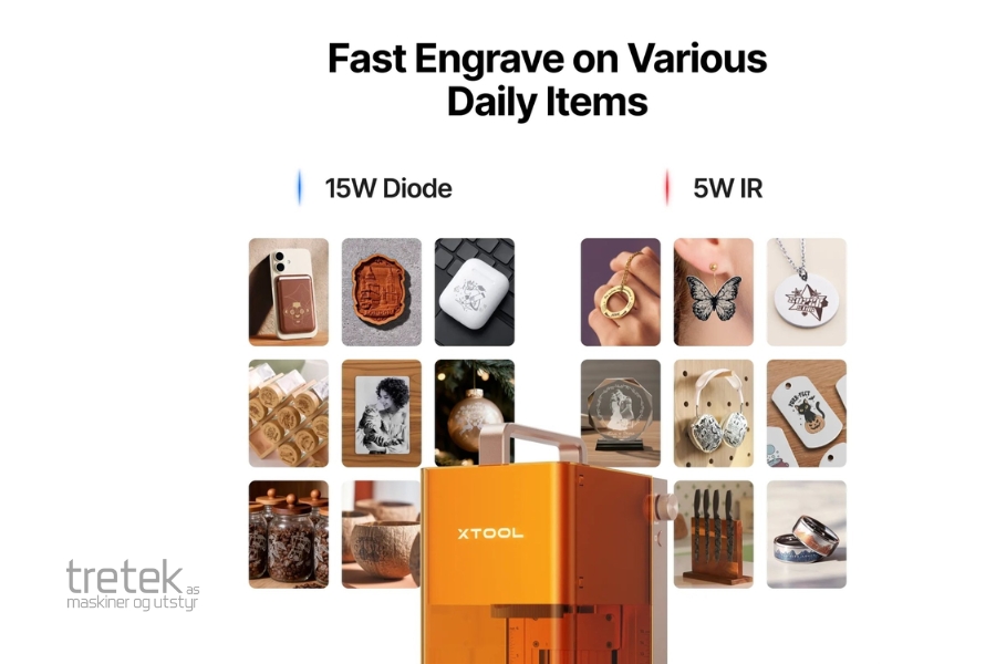 To kraftige lasere in en maskin, en 2W 1064nm infrarød laser og en 10W diodelaser som utvider utvalget av materialer som kan graveres.